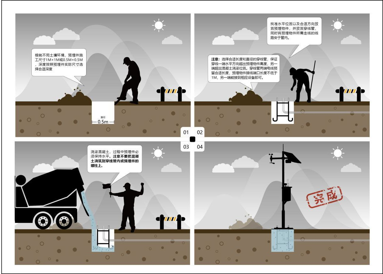 3、布線,根據(jù)訂單需求提前合理布線,包括電源線。如需要布線,澆筑混凝土前,需要先放置穿線管,常規(guī)為PVC材質(zhì)的塑料管,直徑根據(jù)供電線纜尺寸自定。穿線管需高于預(yù)埋件中心預(yù)留孔5cm,另一端以能接到相應(yīng)設(shè)備處為標(biāo)準(zhǔn)。